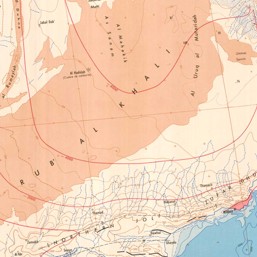 Extensive dune formations are visible in the southeastern regions, with the Rub’ al Khali (Empty Quarter) desert being particularly dominant. These dunes represent Quaternary deposits that cover vast areas of the region.
