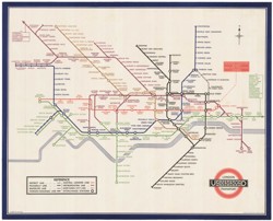 A fine example of an early Beck poster map, issued two years after the first edition of 1933. The original diamonds for the interchanges have already been replaced with circles; a new escalator between Bank and Monument stations has been highlighted with a red sign; and an unnecessary 'North' pointer has been added top right, without Beck's knowledge.