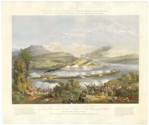 A fine pair of large scenes depicting paddle steamers hauling articulated barges up the Indus. 'Peace' shows the ship laden with trade goods, with a busy quay in the foreground; 'War' shows a ship equipped with cannon firing at Indian troops on the shore and Congrieve rockets aimed at a town on the opposite bank, a reminder that the Indian Rebellion of 1857 had just ended.
