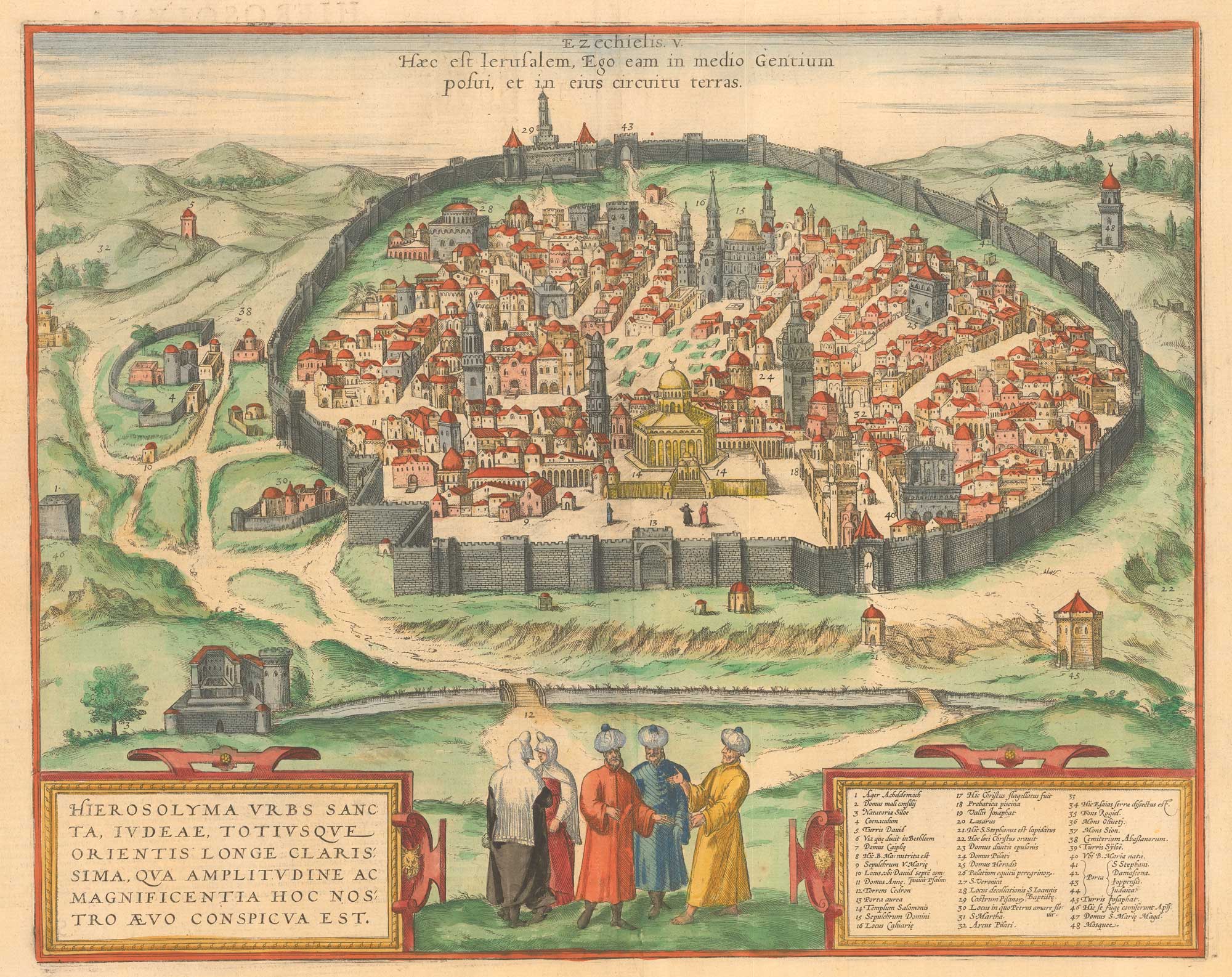 A bird's-eye view of Jerusalem, with a 48-point key listing the sites of the biblical city. However the city is depicted as Islamic: in the foreground are five figures in Arab dress; the Temple of Solomon is topped with a crescent; and outside the city walls is a mosque.