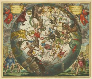 The charts were published in the 'Atlas Coelestis; seu Harmonia Macrocosmica', the only celestial atlas to be produced in the Netherlands before the nineteenth century. It was a compilation of maps of the Ptolemaic universe and the more modern theories of Copernicus and Brahe, and remains the finest and most highly decorative celestial atlas ever produced. It was originally published by Jan Jansson in 1660: this chart comes from Schenk & Valk's reissue.