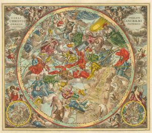 A beautiful pair of celestial charts of the constellations, depicting them not in the traditional Greco-Roman figures but in Christian imagery as envisaged by Julius Schiller in 1627 in an attempt to make the iconography of the stars more relevant to his day. Thus the Zodiac is represented by the Twelve Apostles and Pegasus has become Gabriel. All the figures are shown face on, because Schiller thought it would be an indignity to have them show their backsides. His changes caused him often to be ridiculed and did not catch on, but when they were published his charts were the most accurate available.