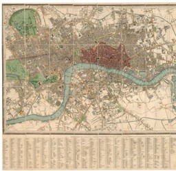 The 'large plan' referred to in the title is Richard Horwood's map, first published 1799. Faden acquired the plates and published an extended second edition in 1807, a third in 1813 and a fourth in 1819. He began issuing this map in 1818 as an index map to the Horwood, continuing with updated editions until 1846.