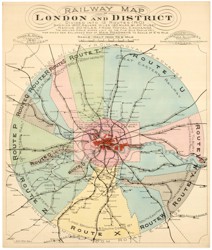 A circular map of the routes of London's commuter railways, extending out to Wraysbury in the west, clockwise to Berkhampstead, St Albans, Ware, Harlow, Ongar, Brentwood, Tilbury Docks. Sevenoaks. Redhill, Dorking and Woking.