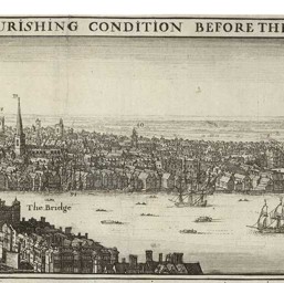 A True and Exact Prospect of the Famous Citty of London, from S.t Marie Overs Steeple in Southwarke in its Flourishing Condition before the Fire. designed by W.m Hollar of Prague, Boh.cn. Another Prospect of the Sayd Citty from the Same Place as it Appeareth now after the Sad Calamitie and Destruction by Fire. In the Year M.DC.LXVI. Wenceslaus Hollar delin: et sculp: 1666. Cum Privelegio.