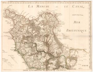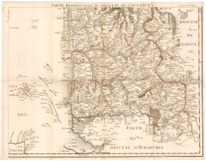 A detailed map of the Diocese of Coutances, covering Normandy and the Channel Islands, dedicated to its bishop. A huge cartouche (containing the title, dedication, key and scale) fills the bottom left sheet.