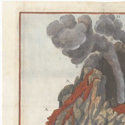 An early illustration of the scientific observations of a volcano erupting. Three men, probably including Lazzaro Spallanzani, stand on a ledge above a crater, with lava flowing down the opposite side.