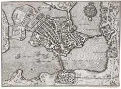 Very finely engraved map of Mantua presented as a bird's-eye view.