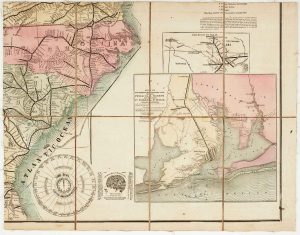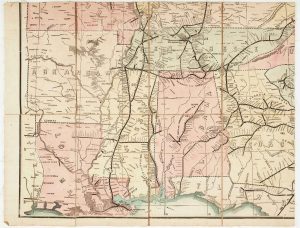 A large map of the United States railway system east of the Mississippi, on a scale of thirty miles to an inch, with insets of the railways of Texas and Pensacola Harbour. This is an early issue, including information about the Southern railroads, removed from latter examples.