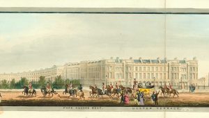 A rolling prospect recording the opulent residences on the perimeter of Regent's Park before the general public were allowed admittance to the park. It shows the original intention of keeping the north undeveloped (preserving the views of Primrose Hill, Hampstead & Highgate), the Nash Terraces and the London Colosseum (at the time housing the largest painting ever created, a 40,000 square-foot panorama of London), with an aviary to the left. Although the Zoological Society of London's gardens (now London Zoo) had already opened, they are not depicted as they lay inside the circuit. In the foreground are little vignettes of life, including an organ-grinder with trained dogs, stilt walkers, a puppet show, laundry carts and William IV and Queen Adelaide in their carriage. The cover illustration shows Portland Place looking north across the park to Hampstead.