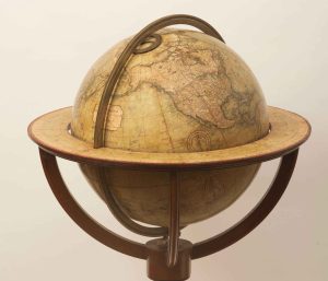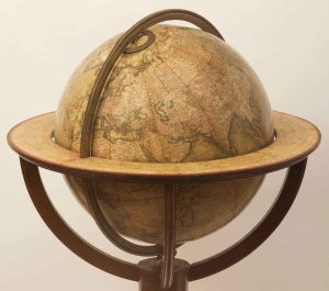 The globe is made of twelve copper-engraved half gores, coloured and varnished. The meridian ring is brass, as is the English-style hour circle between the meridian and the globe. The horizon ring is also a varnished copper engraving.