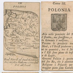 Three playing cards representing Poland, including a miniature map of the country on a tromp l'oeil scroll, a description with a woodblock armorial and two with lists of regional capital cities.