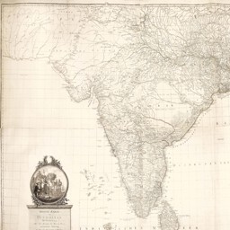 A huge map of India, based on Robert Sayer's four-sheet enlarged version of James Rennell's landmark map of India of 1782, but reintroducing the original's decorative vignette of Britannia receiving a 'Shaster' ('Shastra', a Hindu book of rules).