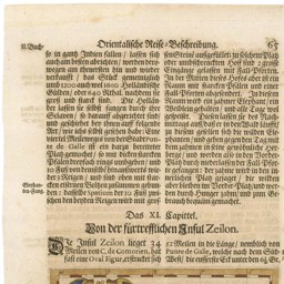 A map of Sri Lanka, orientated with north to the left, published in an account of the travels of Johann Albrecht von Mandelslo (1616-44) from Hamburg to India (1635-9), as edited by Adam Olearius.