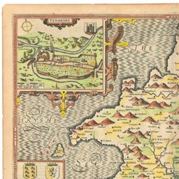 A highly decorative map of map of Pembrokeshire, engraved by Jodocus Hondius for John Speed's county atlas, the 'Theatre of the Empire of Great Britain'. It is decorated with large strapwork cartouches for the title and inset plans of Pembroke and Saint Davids, and eleven armorials.