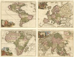 A superb map set of the four continents by the Dutch publisher Van der Aa, issued in his atlas titled 'Le Nouveau theatre du monde', each with a fine title cartouche in full colour.