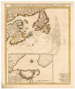 A scarce map of the Eastern Seaboard of America from Cape Fear north and east to the Gulf of the St Lawrence and Newfoundland. An inset on the right sheet details the defensive walls of Louisbourg, the French fortress