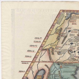 Although it was published in an edition of Ptolemy's 'Geographia', it was not a reduction of a map from the Waldseemüller edition of 1513, but a new one prepared for a new 'Chronica mundi' being written by Waldseemüller. The title, as above, is on the reverse, with a descriptive text in Latin surrounded by woodcut columns.