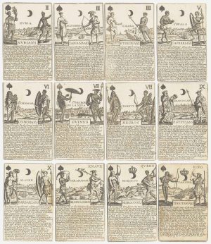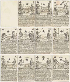 The deck's attribution comes from the Ace of Hearts, which has 'H. Winstanley at Littelbury Fecit' at the bottom. Winstanley (1644-1703) was a painter who is believed to have been taught etching by Wenceslaus Hollar. He also opened 'Winstanley's Water-works' an early amusement arcade in Piccadilly, filled with mechanical gadgets he has constructed. After making a considerable amount of money he became a merchant and, after losing two of his ships on the infamous Eddystone Rocks, he designed and built the first lighthouse there, completed 1698. However he was inside his lighthouse during the 'Great Storm' of 1703 and both he and his lighthouse were swept away.